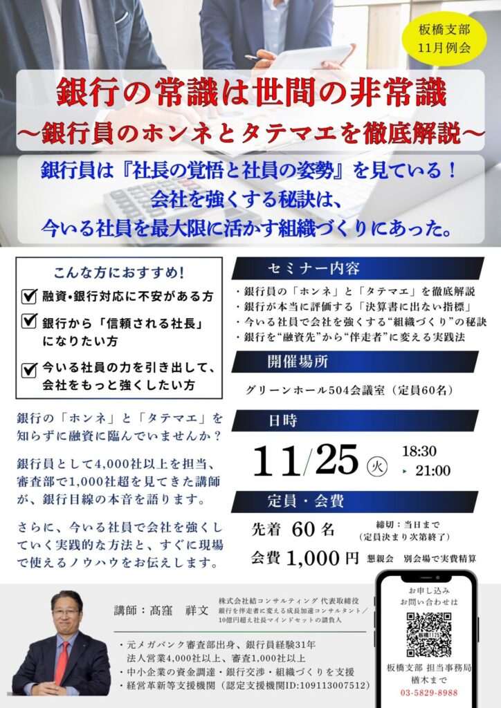 今回の例会内容が、皆さまの銀行活用力の向上、資金繰りの安定、